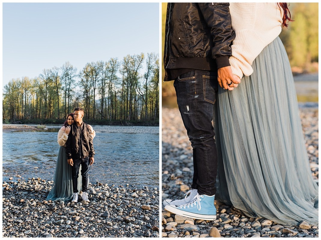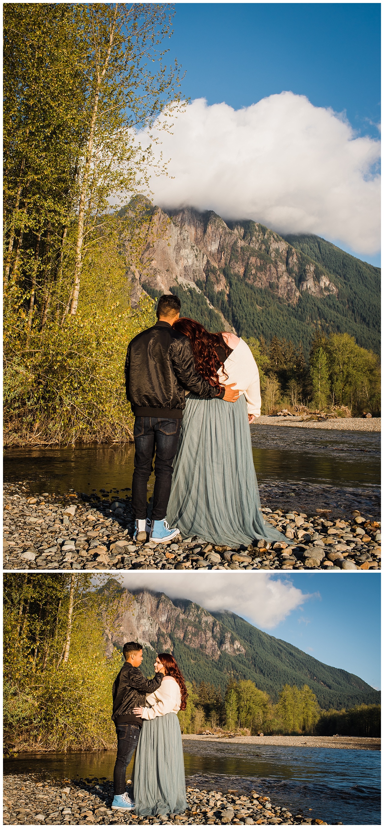 Here’s a love story I captured with the magnificent beauty of Mt. Si. It was a recipe for romance, adventure, and fun. We had a small hike lead us to the river. (good sign seeing a model walking back out with other photographers) We then had to cross the river. Just imagine my thoughts hoping not to fall with all my gear. I made it and couldn’t have dreamt of a greater location to shoot. Snoqualmie is full of spectacular places. You just have to explore to find them.